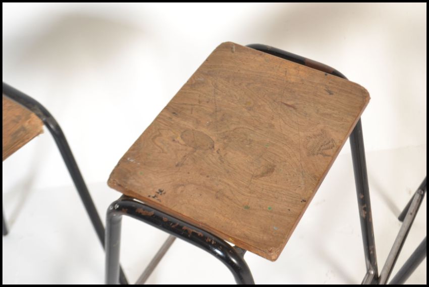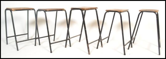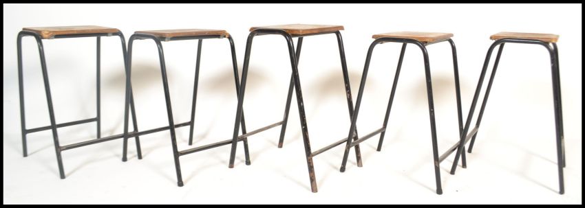 A set of 4 retro 20th century Industrial lab - laboratory stools raised on tubular black metal legs with peripheral stretchers, panel seats above. Measures:  58cm high x 38cm wide x 25cm deep.