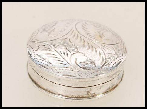 A stamped 925 silver pill box of round form having foliate engraving to the domed lid. Total weight 11.9g.