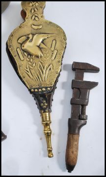 A group of vintage early 20th century metal wares to include preserve pan, pumps, bellows, tools etc.