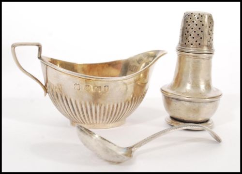 A silver hallmarked creamer jug with makers marks for Thomas Latham & Ernest Morton dating to 1908, together with a silver hallmarked damper and a silver hallmarked sugar shaker with makers marks for W S Savage & Co.