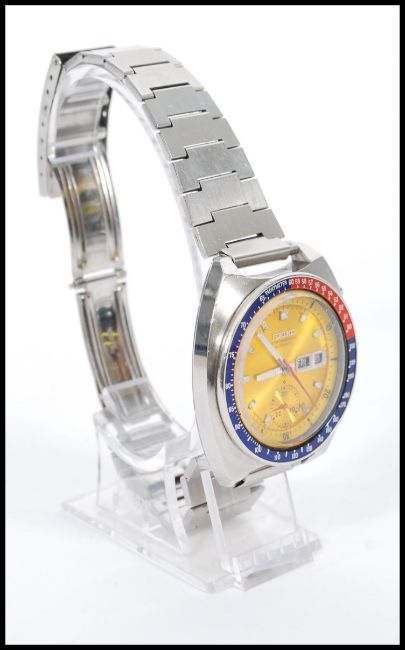 A vintage 20th Century gentleman's automatic chronograph automatic, stainless steel cased wrist watch with a Pepsi bezel, tachymeter scale and rotating inner divers scale bezel, gold baton dial with day/date, on a metal bracelet and luminous hands with a red second hand, on a stainless steel bracelet.