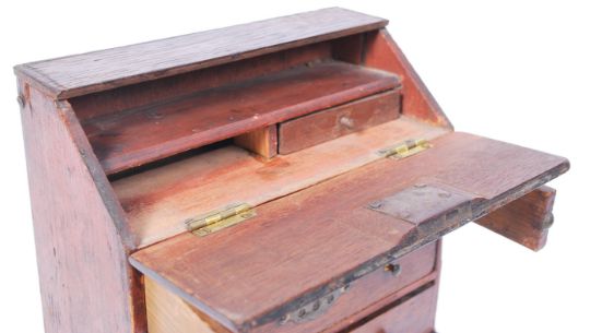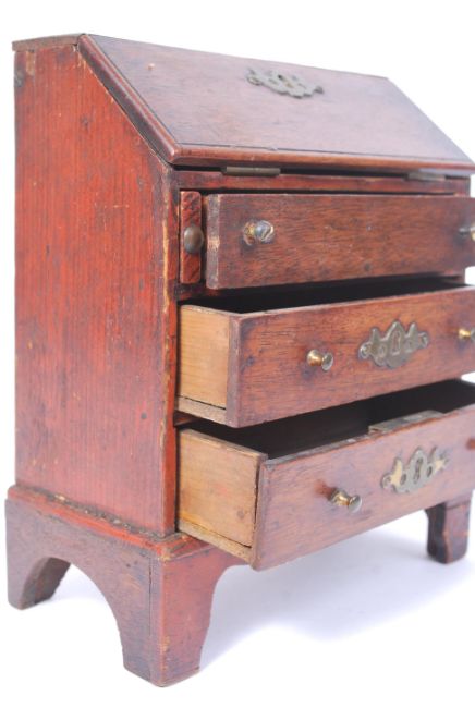A 19th Century Victorian miniature dolls house mahogany bureau having brass batwing key escutcheons fold down front and brass handles. Marked ' J. Bubb. Maker ' to the underside of the bureau. Makers John Bubb who produced large scale dolls house furniture during the 19th Century. Measures 20cm tall x 18cm wide x 8.75cm deep.