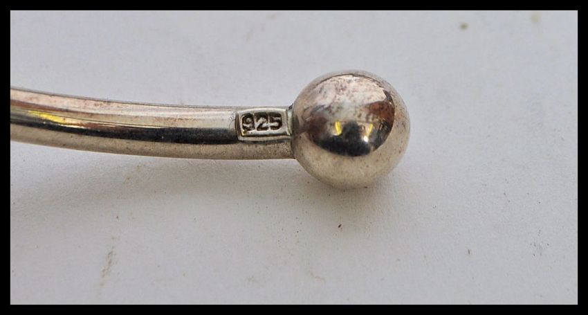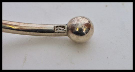 A selection of silver jewellery to include a twist design bangle, a hammered bangle, a heart lock bracelet, a bangle with ball fittings to the end and a hook and eye bangle. Total weight 107g.