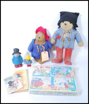 A collection of vintage retro Paddington Bear items to include two stuffed bears, smaller rubber toy and boxed puzzle.