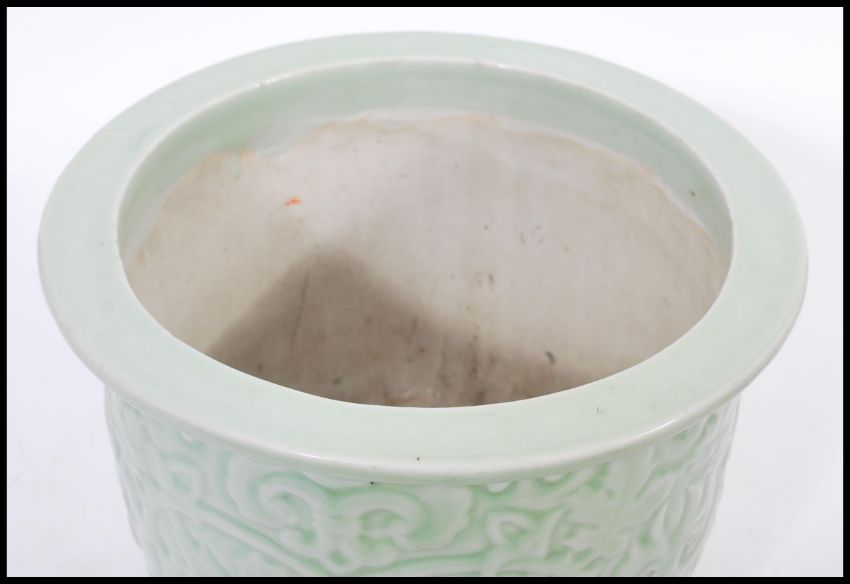 A 19th century Chinese Celadon glaze planter raised on scrolled feet with decoration of swags and scrolls. 25cm high.