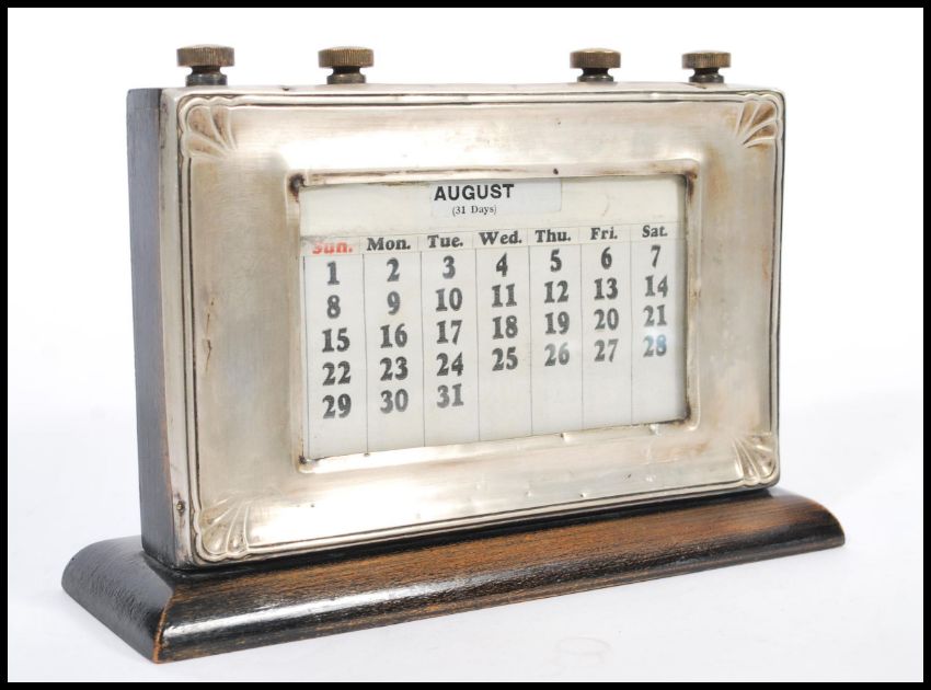 An early 20th century silver hallmarked perpetual desk calendar by W J Myatt & Co mounted on wooden plinth with paper inserts. Hallmarked for Birmingham date letter O.