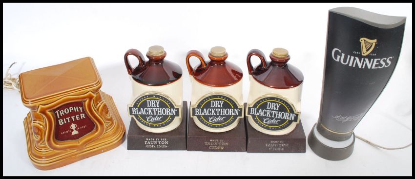A group of vintage retro 20th century pub breweriana ceramic stoneware lamps with notation for Trophy Bitter along with a vintage Guinness glass lamp light. Measures 32cm high.
