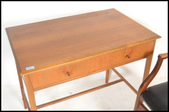 A 1970's teak wood desk with squared legs, pedestal of drawers and a teak wood open armed office chair. Measures:  74cm high x 84cm wide x 54cm deep.