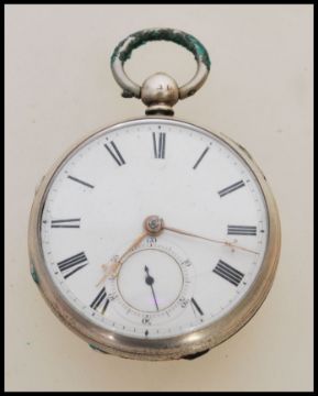 A 19th century Victorian silver hallmarked pocket watch having a fusee movement. The white enamel face having a Roman numeral chapter ring, faceted hands and subsidiary seconds dial to six. Hallmarked for London date letter M. Movement stamped N Price Wolverhampton. Weighs 89 grams. Face 43mm.