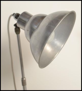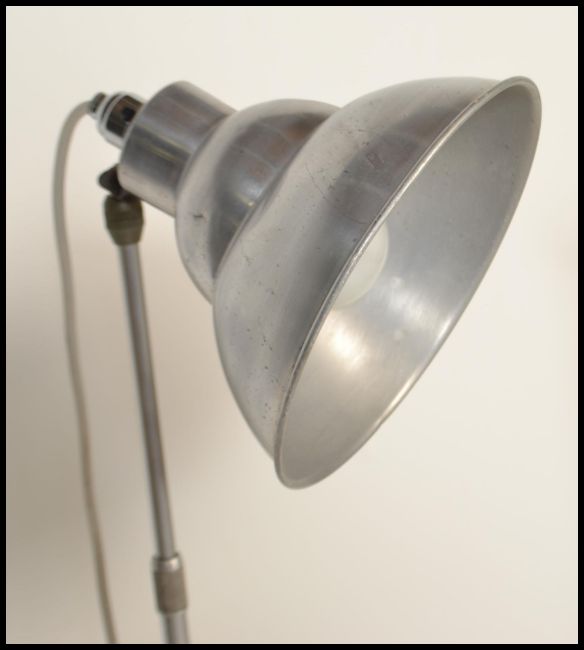 Two vintage retro 20th century telescopic adjustable photographic lamps raised on brushed steel tripod bases with conical pendant shades. Measures:  130cm tall.