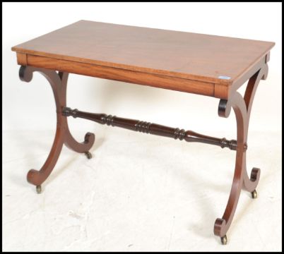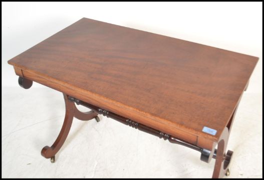 A 19th century Regency mahogany writing table desk being raised on lyre shaped supports united by stretcher and having brass cap castors. Measures: 68cm high x 91cm wide x 50cm deep