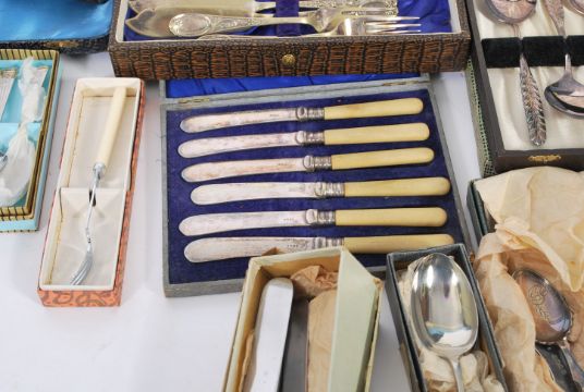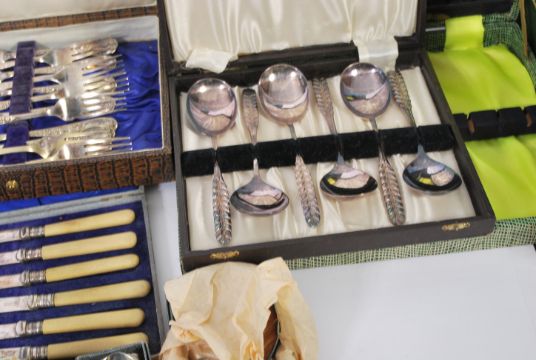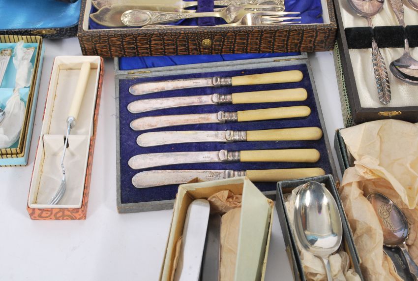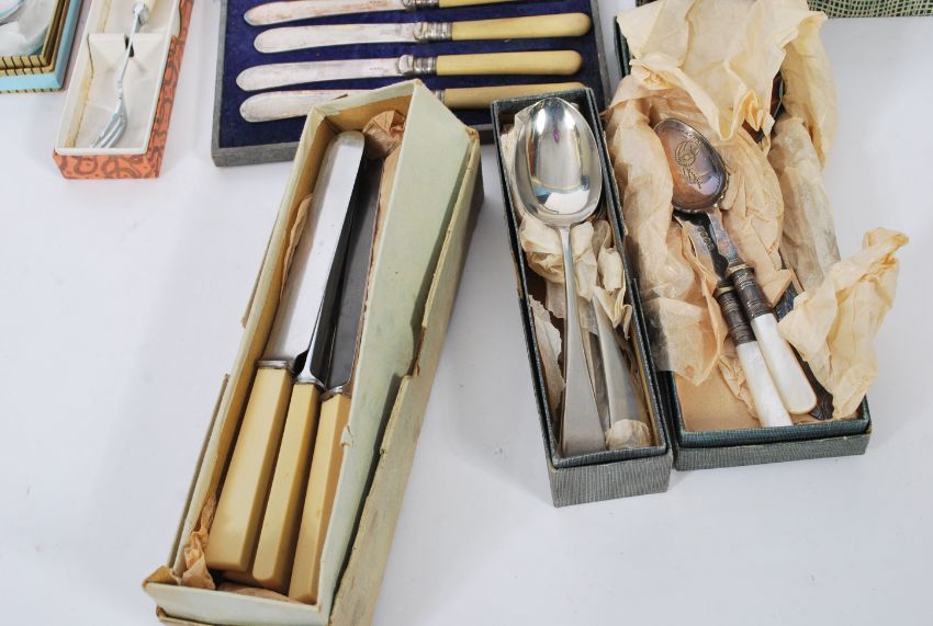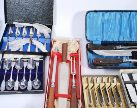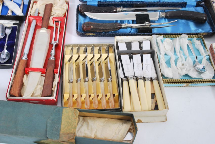 A large selection of vintage boxed flatware to include some silver plate examples, stainless steel, teak handles, cast handles, including knives, forks, spoons, carving set etc.