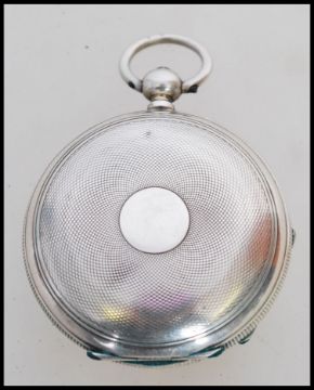A 19th century Victorian silver hallmarked pocket watch having a fusee movement. The white enamel face having a Roman numeral chapter ring, faceted hands and subsidiary seconds dial to six. Hallmarks for Birmingham 1890. Movement 49 Old Market Street Bristol. Weighs 115.2 grams. Face measures 44mm.