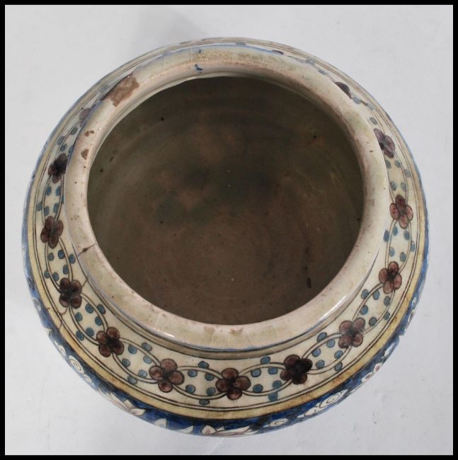 A 19th century Islamic Middle Eastern pottery Faience bowl of bulbous form having hand painted blue and white decoration depicting birds of paradise and flowers. Measures 15cm-high 22cm-diameter.