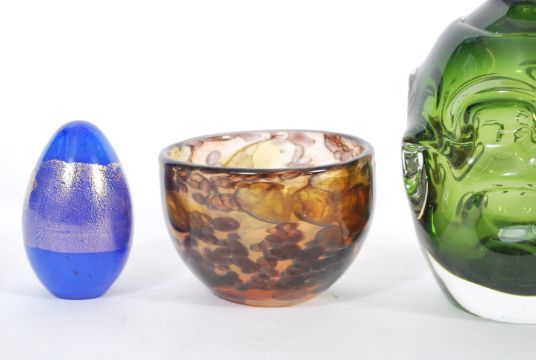 Bo Borgstrom - Åseda Glasbruk a vintage green glass Thumbprint bottle decanter with glass stopper along with an early Isle of Wight glass bowl in a tortoiseshell shell colourway with flamed pontil mark and an Isle of Wight aventurine gold flex egg. 25cm high.