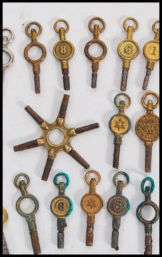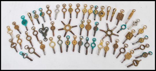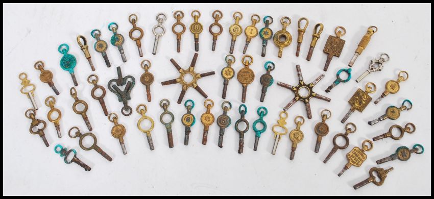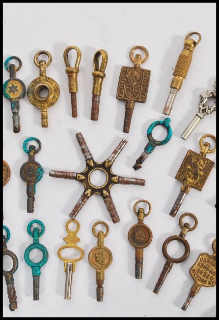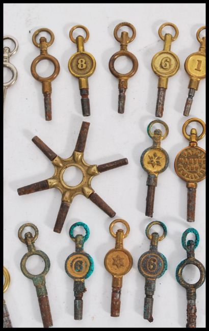 A collection of various vintage pocket watch keys to include HS Samuel, multi keys, Russells, silver etc.