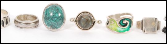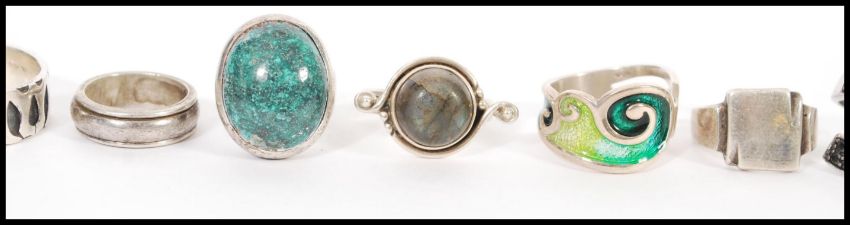 A selection of silver rings to include a green agate and silver ring, a celtic platted design ring, a ring set with a labradorite head, a square signet ring and a selection of other silver rings. Total Weight 80.3g.