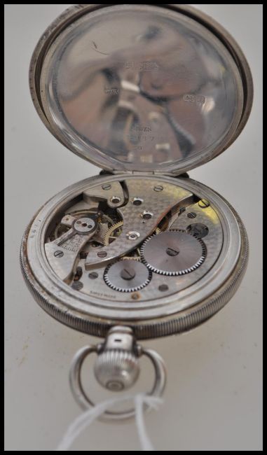 A hallmarked silver early 20th century pocket watch by Dennison having a white enamel face with faceted hands and subsidiary seconds dial. Retailed for H Stone Leeds. Weighs 121 grams.