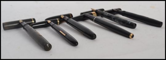 A group of vintage 20th century fountain pens to include Swan 14ct gold nib, Burnham 14ct nib, Parker 17, Parker 14ct nib, Unique 14ct nib, Burnham No54 14ct nib.