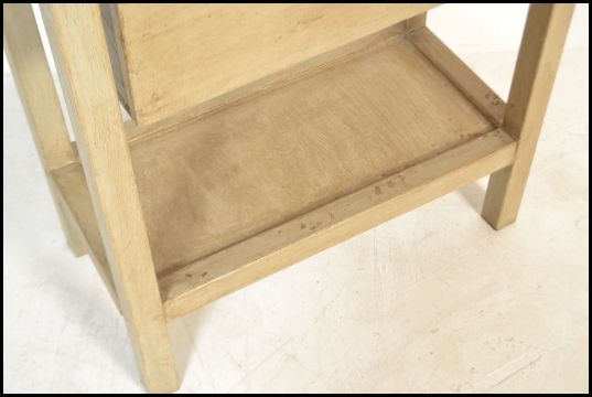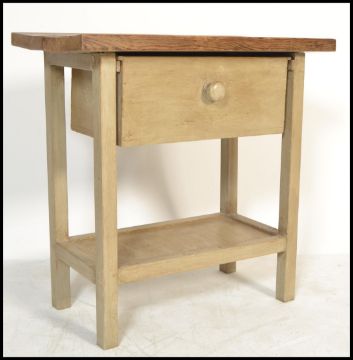 A rustic country limed pine side / occasional table, constructed with square supports united by stretchers, surmounted with a plank top over a large single drawer. Measures:  79 cm high x 81cm wide x 44cm deep.