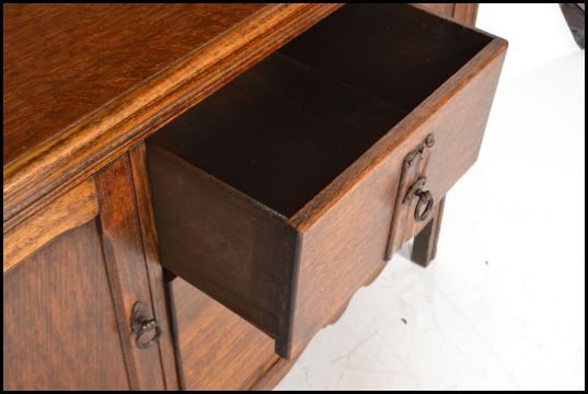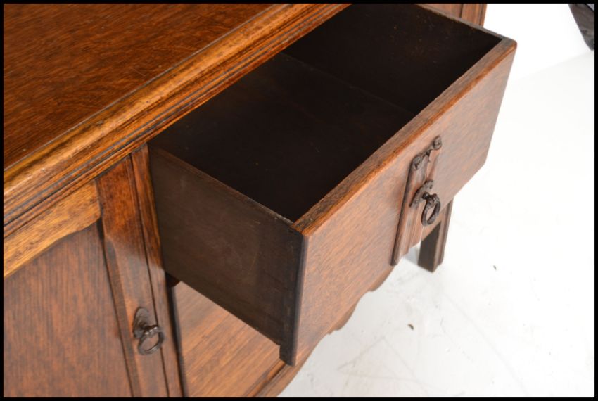 A vintage early 20th century country oak Welsh dresser base having a configuration of drawers and cupboards with plate rack gallery top. Measures:  189cm high x 121cm wide x 45cm deep.