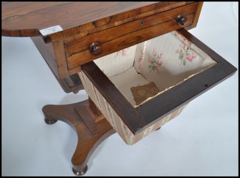An early 19th century Georgian Regency period rosewood work box table being raised on four bun feet with quarter panel veneered base. Shaped solid top over pull out drawer and sewing box with later upholstery. Measures 73cms x 71cms x 41cms