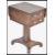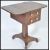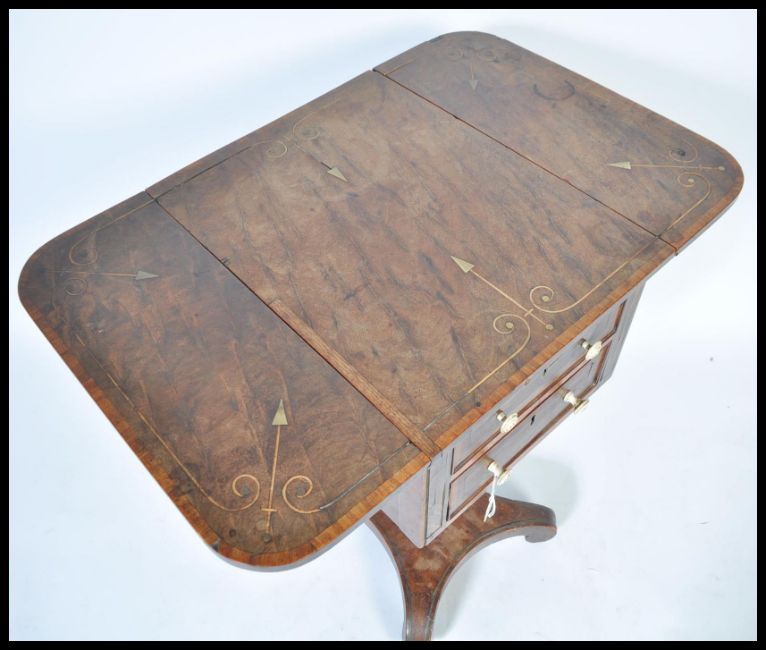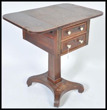 A late 18th century George III mahogany inlalid work box / side table raised on shaped quadruped base with central tapering block column. Twin drop end leaves top with brass and box wood arrow inlaid details. Shaped turned ivory/bone handles with twin drawers to one side and false drawers.