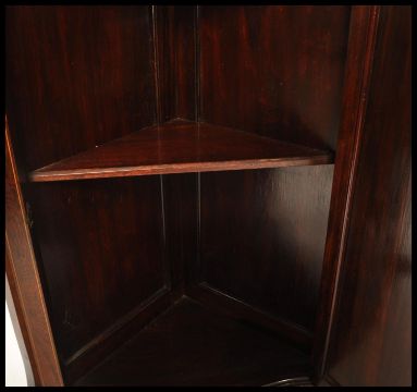 A 19th century rosewood marquetry and bone inlaid hanging corner cabinet. The door with stunning marquetry inlaid details of cornucopia and swags flanking a central maiden, Inset shelf within. Measures 62cms by 52cms by 28cms.