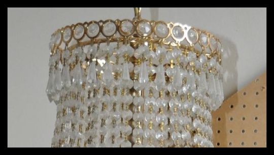 A 20th century large facet cut glass and brass electrolier chandelier.ÿ Having cut glass strings draping down to the rim having further facet cut drop glass lustres. The centre with electrical bulb mounts having ten spaces to each with 6 in the central upright . Measures approx 75 cms exc chain