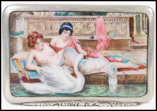 A 19th century enamel top pictorial silver ( tested ) snuff box of rectangular form. The foliate thumb piece in front of erotic enamel scene of Leda & The Swan in the pre-raphaelite style. Measures 7.5cms long x 5cms depth