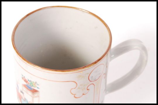 A Chinese Armorial 18th century large mug having white glaze with handpainted scenes of family interiors scenes with geometric decoration to borders. Measures 14cms high x 11cms diam