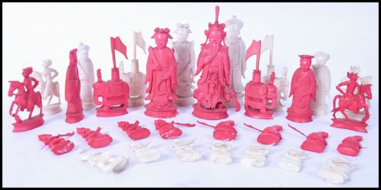 A 19th century Chinese / Cantonese ivory chess set being intricately carved and stained red to one half of the set, natural ivory to the othe half.  Largest piece ( king )measures 11cms tall