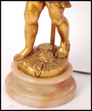 A 20th century classical revival gilt plaster putti / cherub lamp being raised over a veined alabaster socle plinth. Gilt metal reeded electrical column mount rising to lamphead. Measures 55cms high