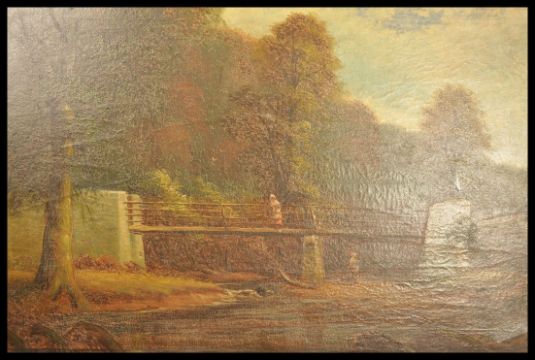 George Harris (British, 1855-1936) An oil on canvas painting of Snuffy Jacks bridge, Snuff Mills, Stapleton, Bristol. Otherwise known as Ha'penny bridge. Signed to the corner and set within a good gilt frame. Measure 85cms wide x 54cms high ( canvas )