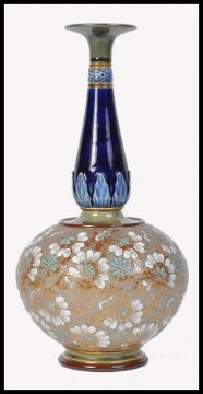 A large Royal Doulton large Slaters balustered spill vase having a cobalt blue narrow neck over onion shapedÿ lower body painted typically in shades of blue and cream on a leather coloured glazed ground with geometric foliage. Impressed marks to the underside. Measures 40cms high
