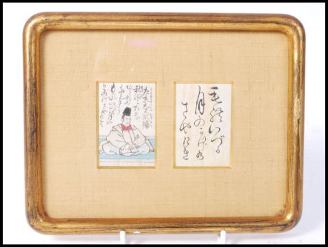 A 19th century Japanese Meiji framed and glazed wood block print of a poem by Akisuke - One Hundred Poems from One Hundred Poets. Out of the rifts of clouds of night. There by the wind of autumn blown appears the moon so fair and bright, Sailing the misty skies alone. With pictorial scene of a seated scholar in the lotus position, framed and glazed. Meaures 21.5cms x 17cms