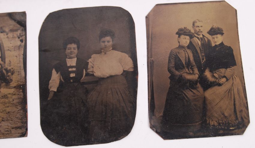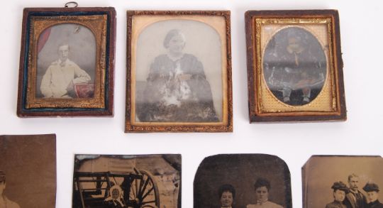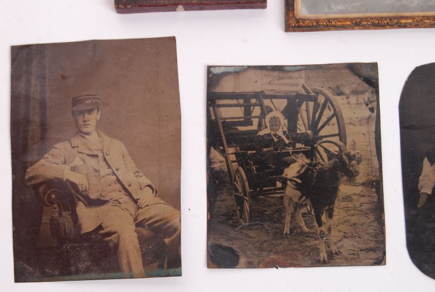 A good collection of 7x assorted antique 19th century Daguerreotypes and Ambrotypes. Comprising of: a ninth-plate size ambrotype depicting a gentleman in white - with some red tinting, a ninth-plate ambrotype depicting a a well dressed girl (some wear to backing), a larger sixth-plate ambrotype of a of a lady (some wear to backing), an unframed Daguerreotype depicting a gentleman and two ladies (full length pose), a daguerreotype of two sisters (unframed), an unframed daguerreotype of a child in a goat-pulled cart, and the final daguerreotype being of a gentleman seated, with his hat (possibly a very early postman or similar). Unframed images odd sizes. Generally interesting compilation.