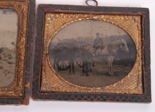 Two antique 19th century sixth-plate size Ambrotype photographs. Both believed to be American. The first depicting two ladies sitting in a hole on a beach, and the second depicting a horse and cart with two boys. Both mounted in brass surrounds, within frames. Total sizes approx: 9.5cm x 8cm.