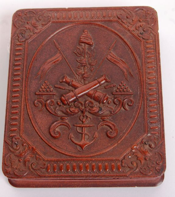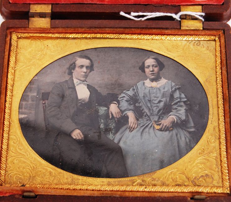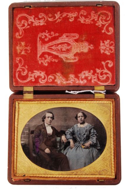 An incredibly rare 19th century c1860 American Civil War era quarter plate tinted ambrotype photograph. Depicting a gentleman and lady sat facing the camera. Framed in beautiful gold surround, with gold wire braiding. Mounted within a cushioned thermoplastic case, with various Union symbolism ( Artillery ) - cannons, anchor and flags. Condition generally fine, with no damage to the ambrotype. Case measures a total size of: 10cm x 12.5cm. Rare.