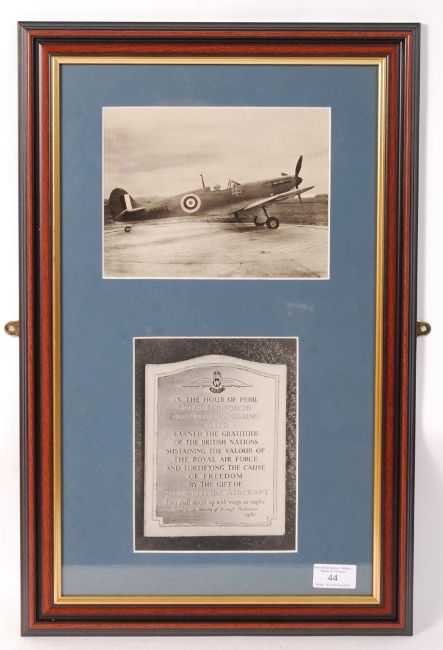 A pair of rare original WWII Second World War Spitfire related black and white photographs. The first showing a plaque which reads ' In The Hour Of Peril, British Reinforced Concrete Engineering Co. Ltd Earned The Gratitude Of The British Nations Sustaining The Valour Of The Royal Air Force And Fortifying The Cause Of Freedom By The Gift Of Two Spitfire Aircraft ' and dated 1941. The top picture showing one of the said Spitfires. Framed and glazed to a total size of: 54cm x 35cm
