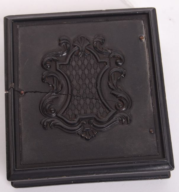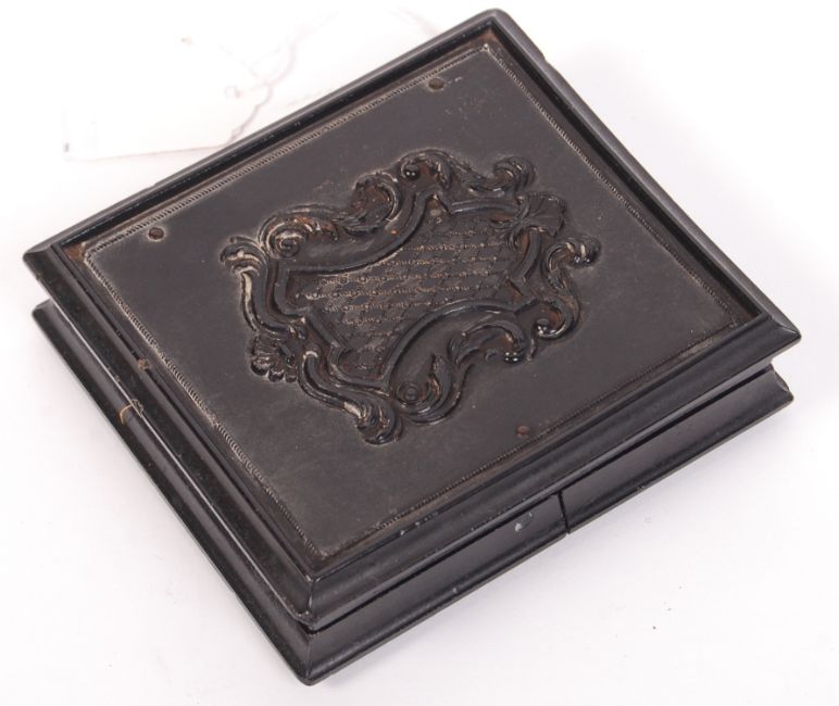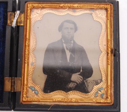 A rare antique 19th century c1850 American Civil War era sixth plate Daguerreotype photograph by AP Critchlow & Co. Depicting a bearded gentleman in a 3/4 length pose. Framed in beautiful gold surround, with gold wire decorated braiding. Mounted within a cushioned thermoplastic case. Some splitting to rear of case. Total size: 8.5cm x 9.5cm