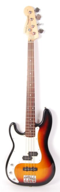 A Fender Squier left-handed ' Precision Bass ' electric bass guitar, once owned, used and signed by actor Mark Wahlberg. Originally purchased in a VH1 ' Save The Music Foundation ' charity auction. The certificate reads ' ...the Mark Wahlberg Autographed Fender Bass you purchased in the...auction (2002) is authentic, and was signed and donated by Wahlberg from his personal collection to benefit the VH1 Save The Music Foundation .' Not mentioned on the certificate, but during the auction, was that this guitar was used in the movie ' Rockstar ' in which Wahlberg starred in 2001. This guitar therefore, should be considered a prop.