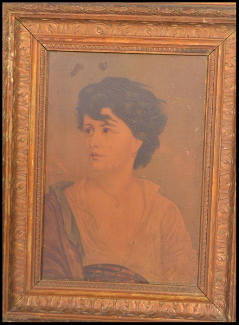 A pair of 19th Century framed oleograph prints depicting a man and a lady in carved wood and gesso gilt frames having moulded acanthus leaf and floral detailing. Measures:  29cm high x 20cm wide.