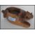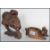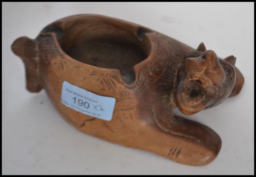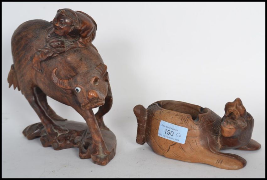 Two early 20th century carved Chinese wooden figurines to include an ox on plinth base with man riding and glass eyes, and the other a beast carved into an ashtray. 20cm high.