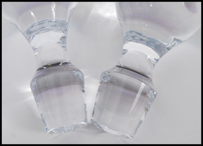 A pair of vintage 20th century cut glass crystal leaded decanters having faceted bulbous bodies with matching stoppers. 33cm high.