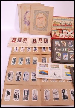 A large collection of vintage cigarette cards in albums and sets dating from the early to mid 20th century along with a quantity of vintage postcards of similar age.
