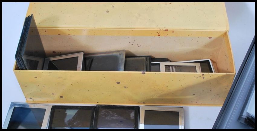 A selection of varied vintage slides to include magic lantern slides of India, early 20th Century glass slides featuring community gatherings, mountain landscapes, along with some later mid 20th Century slides on acetate featuring family scenes on the beach, and film sections with images of London.
