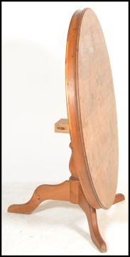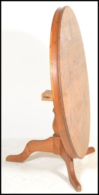 A 20th Century pine dining table having a circular top raised on a central turned column above three splayed and shaped legs. Measure:  74cm high x 137cm diameter.