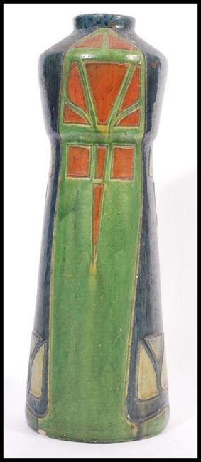 An early 20th century studio pottery vase in the Art Nouveau Secessionist  manner. Tapering body with waisted centre having green ground and geometric decoration. 43cm high 15cm diameter.