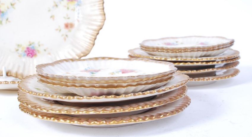 A selection of 19th century Nautilus Porcelain, of moulded fluted form, painted with flowers having gilt rims, marked to the base, to include saucers, side plates and two dinner plates. Measures 7cm-high 24cm-diameter.
